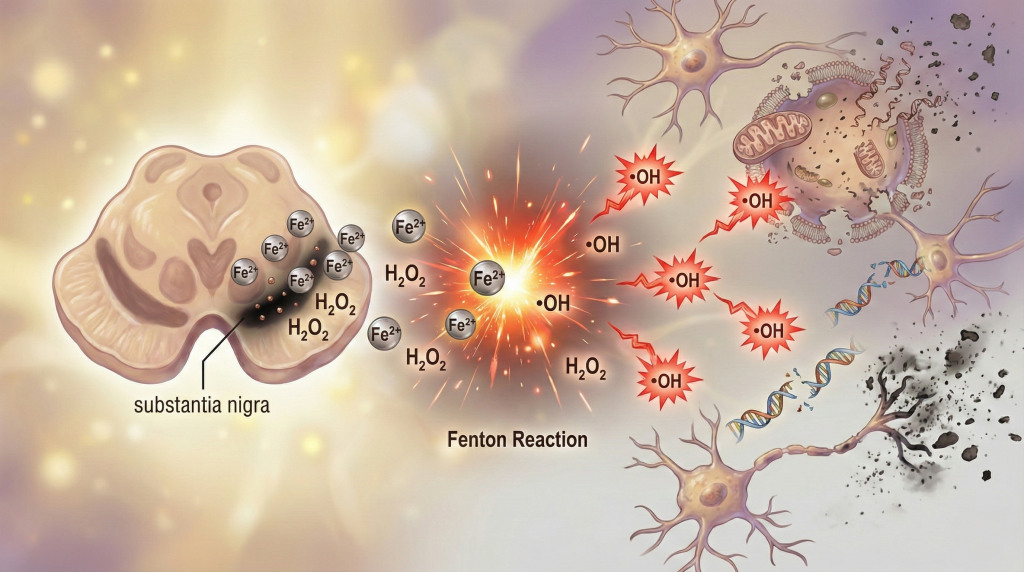 そこに、ドーパミンの代謝などで生まれた過酸化水素(H₂O₂)が増えてくると、状況が一気に悪化します。鉄と過酸化水素が反応すると、フェントン反応と呼ばれる反応が起こり、反応性の非常に高いヒドロキシラジカルが生まれやすくなるからです。