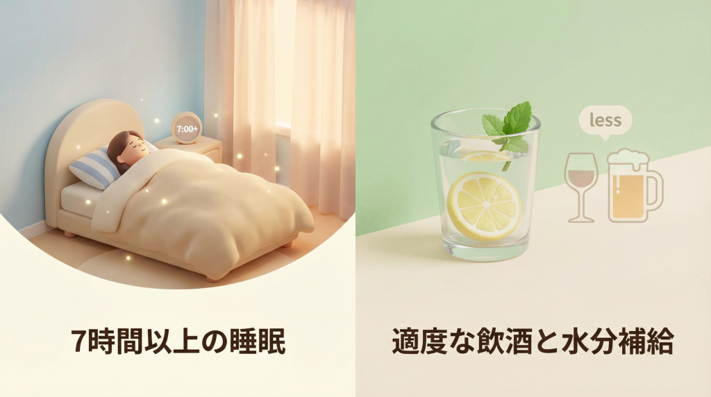 過度な飲酒を控える:睡眠の質や酸化ストレスにも影響し、負担を増やしうる