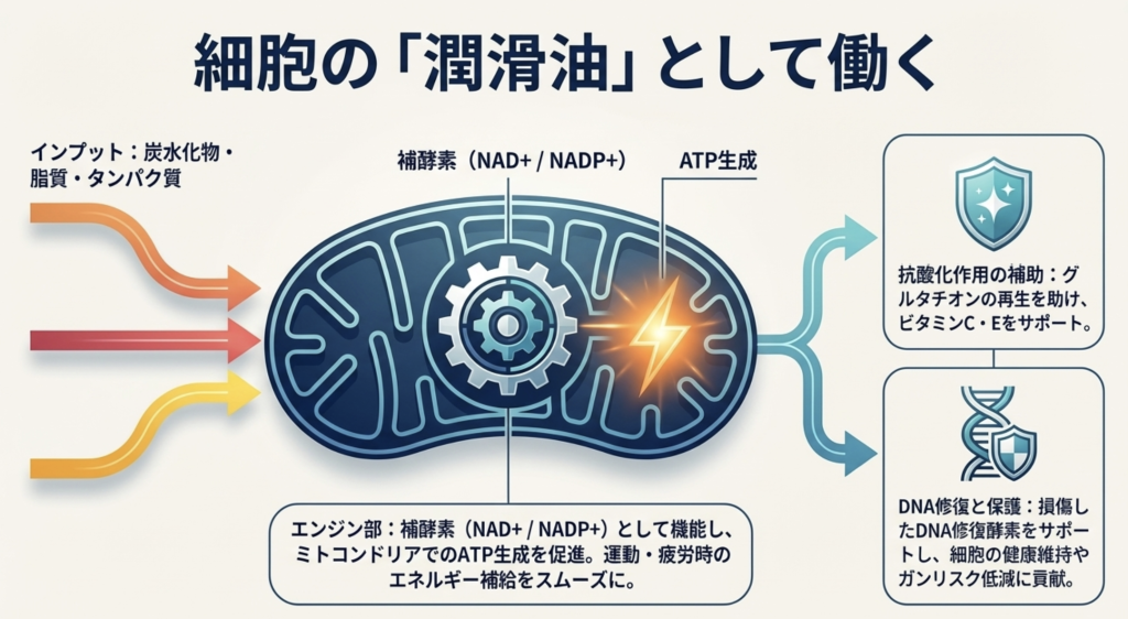 特に重要なのが、体内でNAD+・NADP+という補酵素(体の化学反応を助けるサポーター)の材料になることです。少し難しく聞こえますが、イメージとしては「細胞の発電所(ミトコンドリア)の燃料係」と考えるとわかりやすいかもしれません。