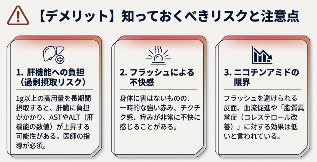 まず肝臓への負担。1g以上の高用量を長期間にわたって摂り続けると、肝機能の指標であるAST・ALTが上昇する可能性があります。「フラッシュを避けたい」という理由で選ばれることがある持続放出型(スローリリース型)は、常に肝臓の解毒経路を稼働し続けさせるため、即効型より肝毒性リスクが高いとする専門家の意見もあります。