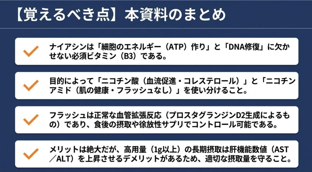 フラッシュは不快ですが数十分で終わり、肝臓に休む時間を与えられる即効型の方が長期的に安全であるという考え方も根強くあります。高用量でのサプリ使用を検討している場合は、定期的な血液検査で肝機能を確認することが望ましいでしょう。