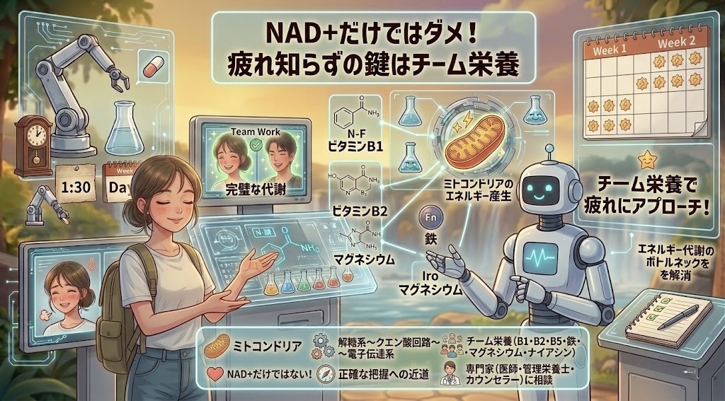 解糖系からクエン酸回路、電子伝達系へと続くエネルギー産生の連鎖には、ビタミンB1・B2・B5、鉄、マグネシウムなど、多くの栄養素が同時に必要です。どれか一つが欠けていれば代謝のボトルネックとなり、NAD+だけを増やしても効果は限定的になります。