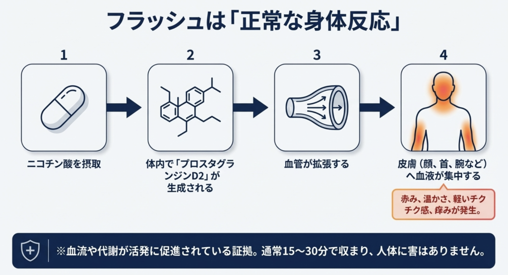 私が経験した症状の正体はこうです。ニコチン酸を摂取すると、皮膚のランゲルハンス細胞や免疫細胞がGPR109A受容体を介して刺激を受け、プロスタグランジンD2(PGD2)と呼ばれる物質が放出されます。これらが毛細血管を拡張させることで、皮膚への血流が増加。顔や首、体幹に赤みや熱感、かゆみなどが生じます。